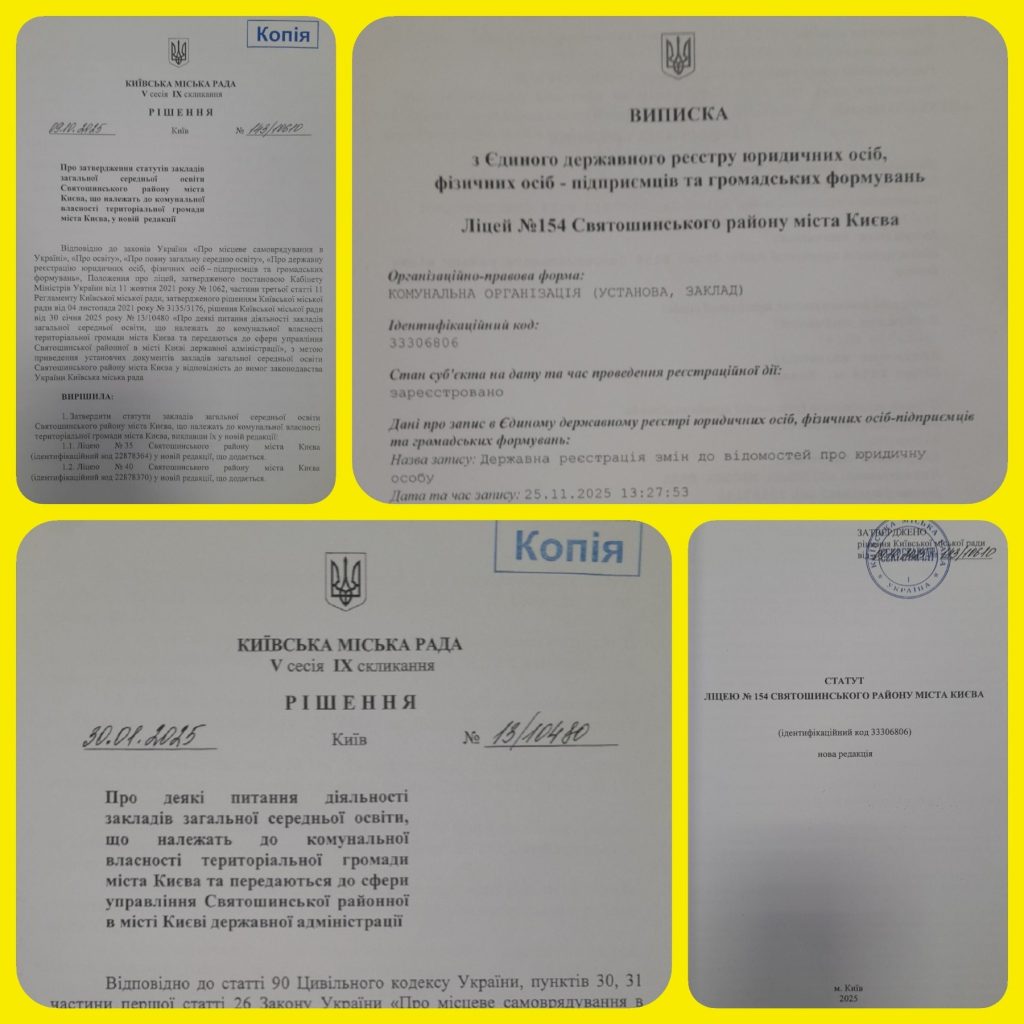 Повідомляємо, що відповідно до рішення V сесії ІХ скликання Київської міської ради від 30.01.2025 № 13/10480 та від 09.10.2025 № 143/10610 змінено тип та перейменовано Київську гімназію № 154 Святошинської районної у м. Києві державної адміністрації на Ліцей №154 Святошинського району міста Києва.
